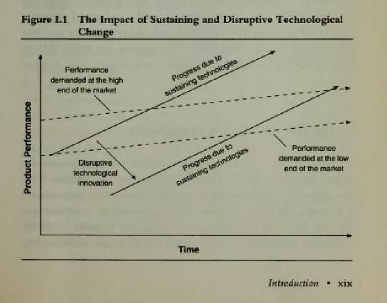That is the most interesting insight here: disruption is not just a technological event. It is also a perceptual and organizational problem. On page xix, the graph labeled “The Impact of Sustaining and Disruptive Technological Change” visually sharpens the point. Sustaining innovation climbs faster and faster up the performance trajectory, while disruptive innovation enters below the mainstream market’s expectations. But the market itself does not stand still. Needs at the low end and high end shift differently, and firms can end up overshooting what many customers actually require. In other words, companies can improve themselves into vulnerability. That is a powerful idea because it turns the standard story of progress upside down. More innovation is not always strategic wisdom; sometimes it is a way of becoming increasingly well-adapted to the wrong game.