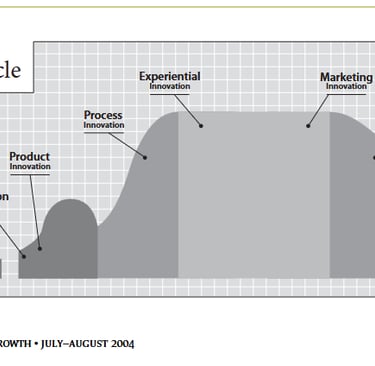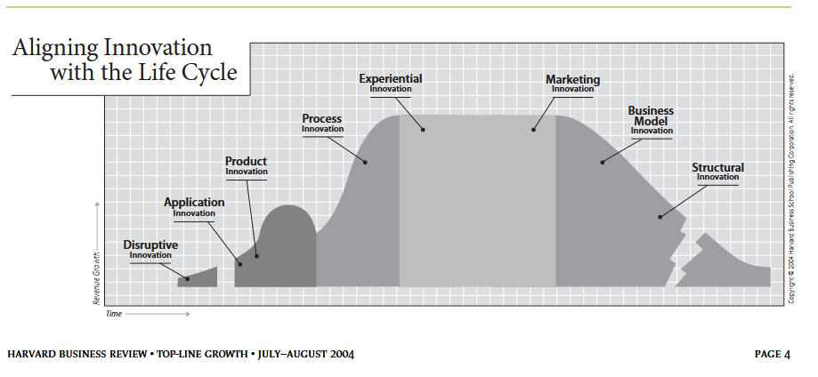 What makes the article especially useful is the taxonomy it builds. Moore distinguishes disruptive, application, product, process, experiential, marketing, business model, and structural innovation. That alone is a helpful corrective, because it broadens the concept of innovation beyond breakthrough products. But the article’s real contribution is linking those forms to the market development life cycle. In the early phases, product-oriented forms of innovation dominate. Later, once markets mature and commoditization sets in, process, experiential, and marketing innovation become more valuable. And when decline approaches, the serious question is no longer how to improve the existing offer, but whether the firm can reinvent its business model or structure before the fault line opens beneath it. The chart on page 4 makes this especially clear by mapping innovation types onto the life cycle itself.